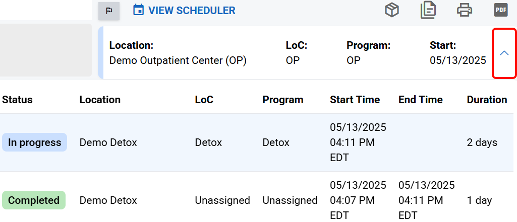 Click on the carrot to show the patient’s treatment episodes history and switch between encounters, if needed.