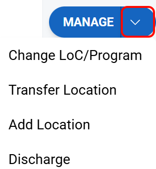 You can click on the Manage carrot to Change LoC/Program, Transfer Location, Add Location, and Discharge.
