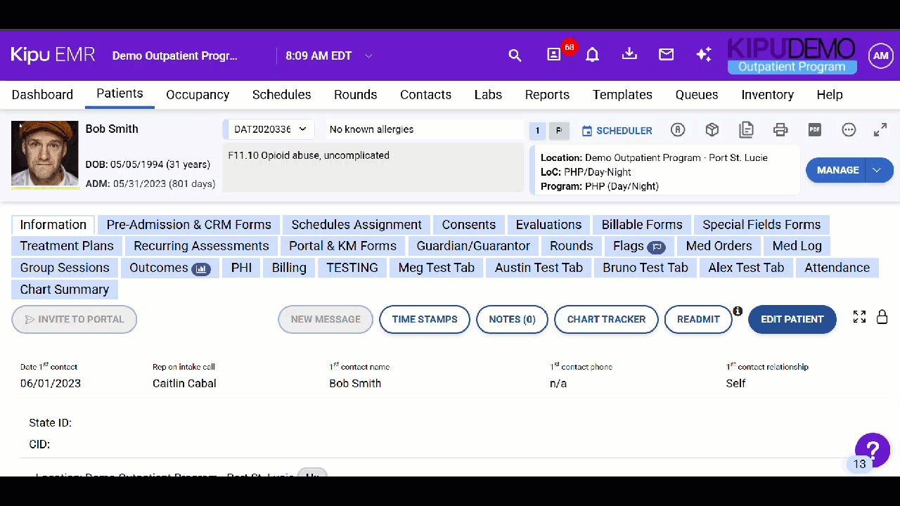 - Status: Patient statuses entered in the facesheet. Use passes or suspended privileges including money, phone, internet access, smoking, etc.
