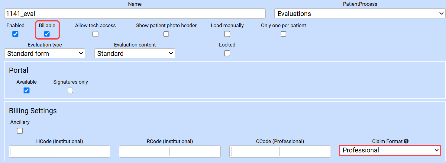 Billing: Added the claim format selector to evaluation templates when the Billable checkbox is enabled. This update is in preparation for new billable, outpatient workflows. For more information on billable evaluation templates, click here.