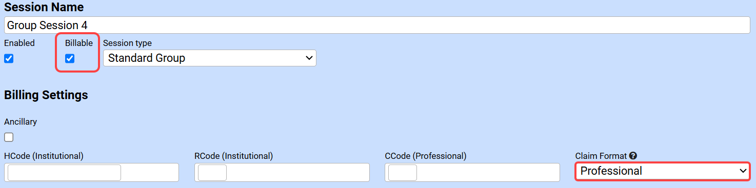 Billing: Added the claim format selector to group session templates when the Billable checkbox is enabled. This update is in preparation for new billable, outpatient workflows. For more information on billable group session templates, click here.