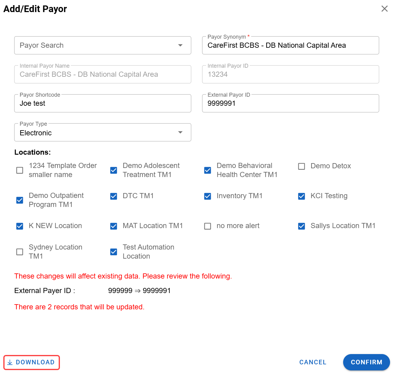 - Billing: Users can now download the Affected Patients list when making changes to payors in the Payor Settings screen. This change will help users ensure that they understand the impact of the change and see which patients will be updated. For more information on the Payor Settings tab, click here.