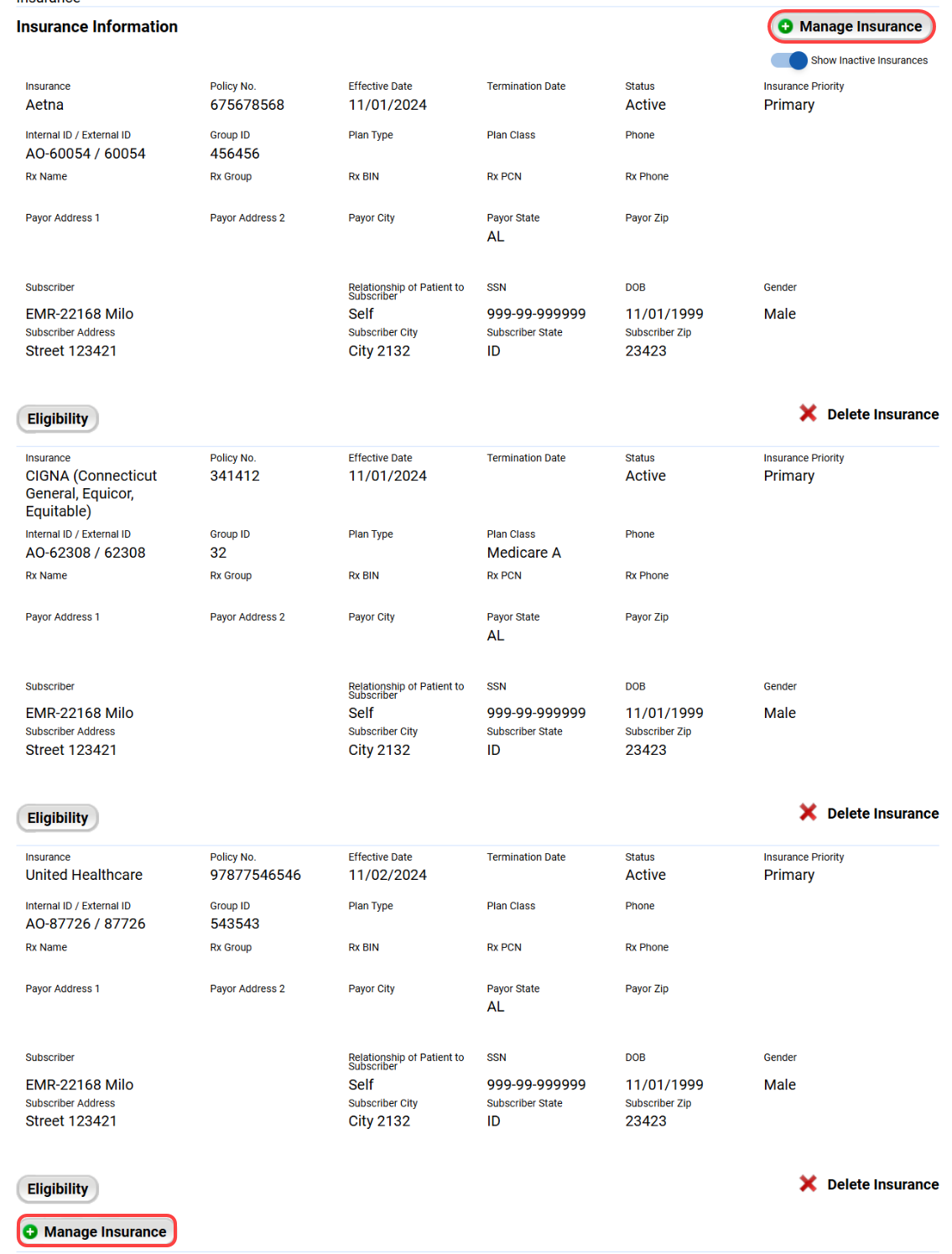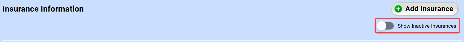 - Billing: Added a new Show Inactive Insurance toggle which allows users to show or hide inactive insurances on the facesheet. For more information, check out this article.