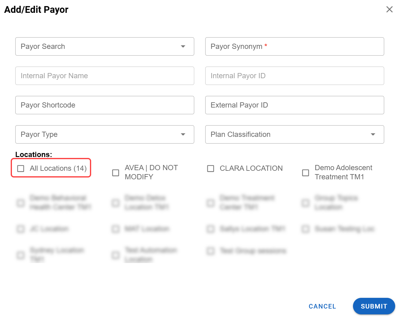 Billing: Added an All Locations checkbox to the Add/Edit Payor window which allows users to quickly make the payor available in all locations. If this checkbox is selected, any locations added to the instance will be automatically selected. For more information on Payor Settings, click here.