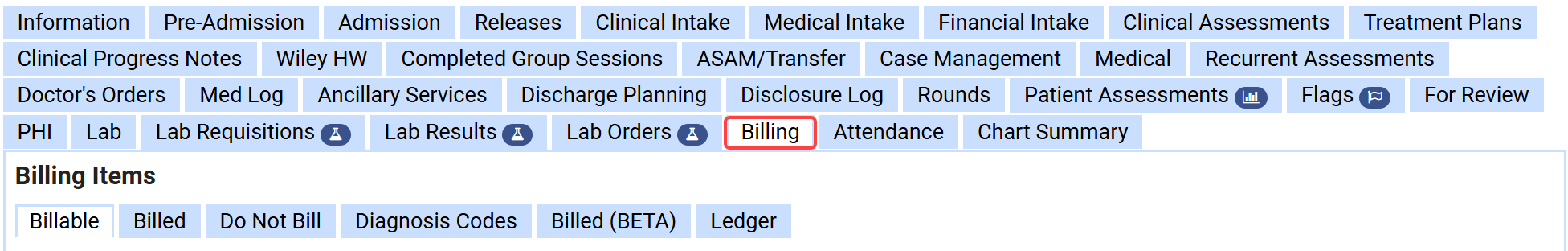 For information on the Billable, Billed, Do Not Bill, and Ledger tabs, check out this article, which covers billing audit tool reports and the ledger. The instructions will be the same but for the entire instance instead of for an individual patient.
