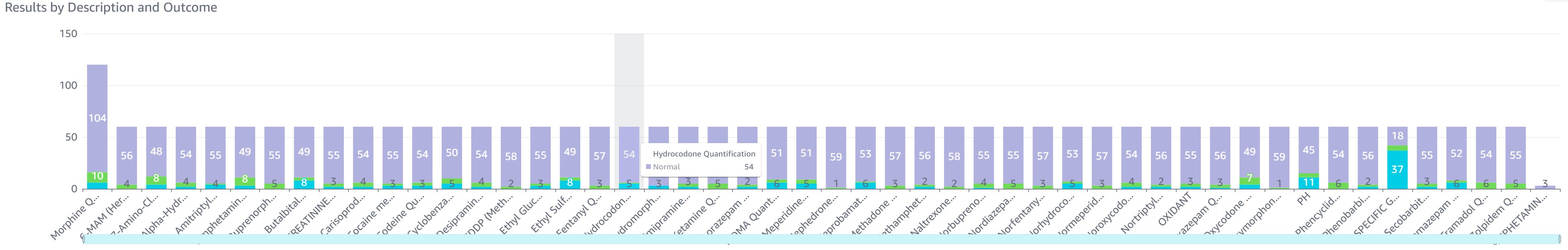 - Results by Description and Outcome: This chart displays results by test stacked by result flag