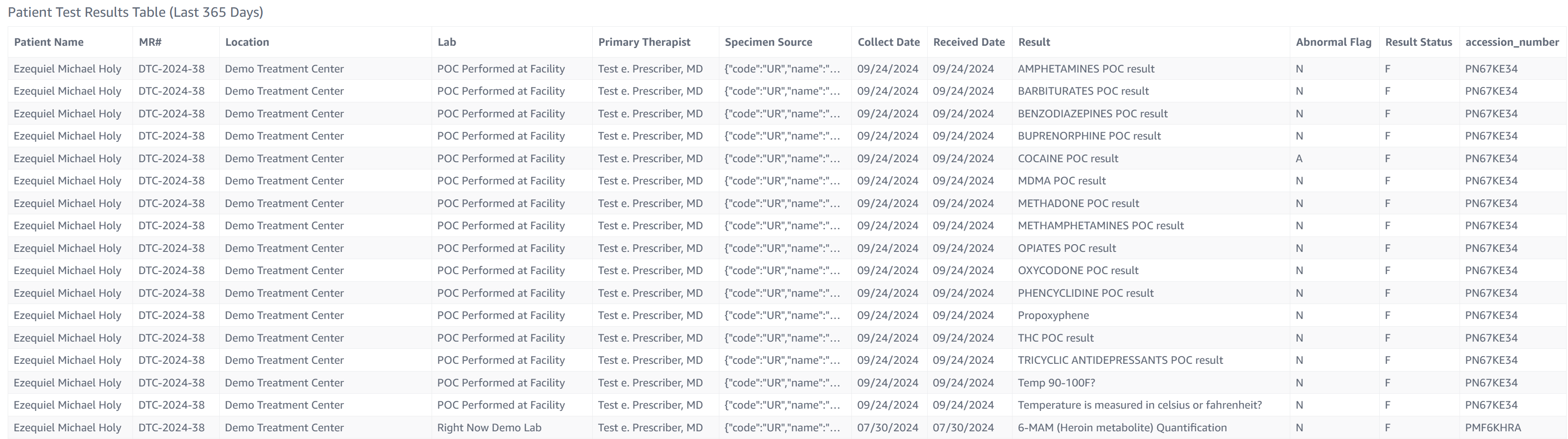 Patient Test Results Table (Last 365 Days): This table displays details for all patient test results in the last year: