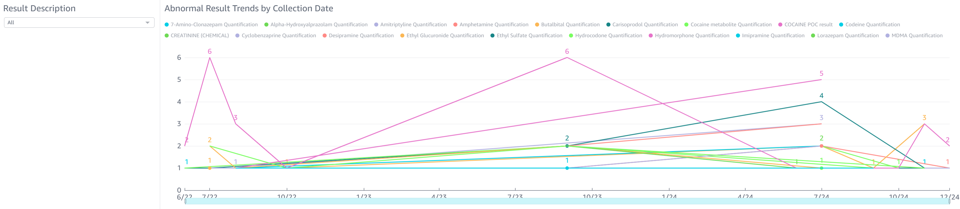 - Abnormal Result Trends by Collection Date: This chart shows the number of abnormal results across all patients in census (if current census is selected) for each test per collection date. The trend helps identify if there are periods when patients tend to relapse more often or if any other abnormalities are present.
