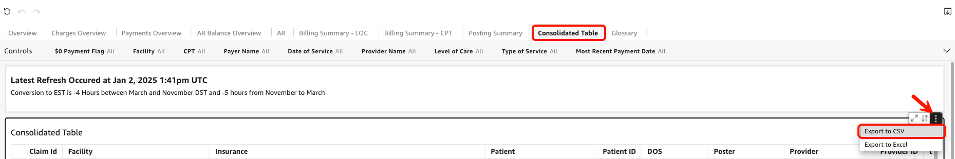 - To download your data, we recommend opening the Revenue Cycle Dashboard and navigating to the Consolidated Table tab. From here, click on the three dots in the top right and choose Export to CSV.