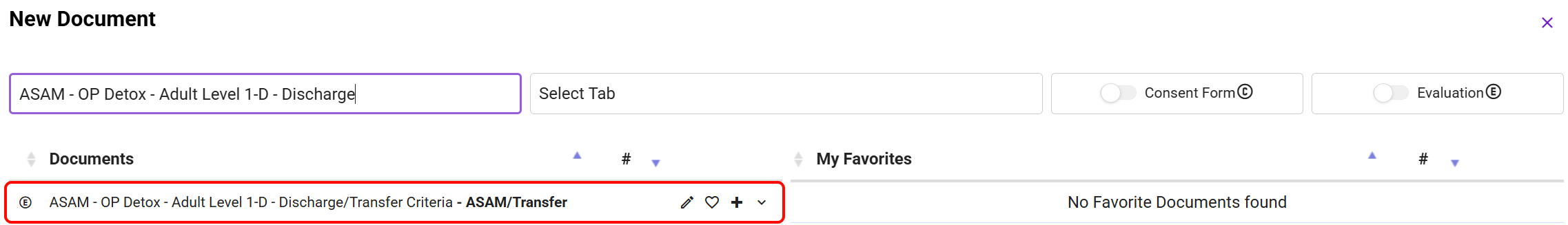 Readiness for Change: Add the ASAM Discharge evaluation using the centralized documentation icon to enter the level of care change and criteria met along with clinical judgment.