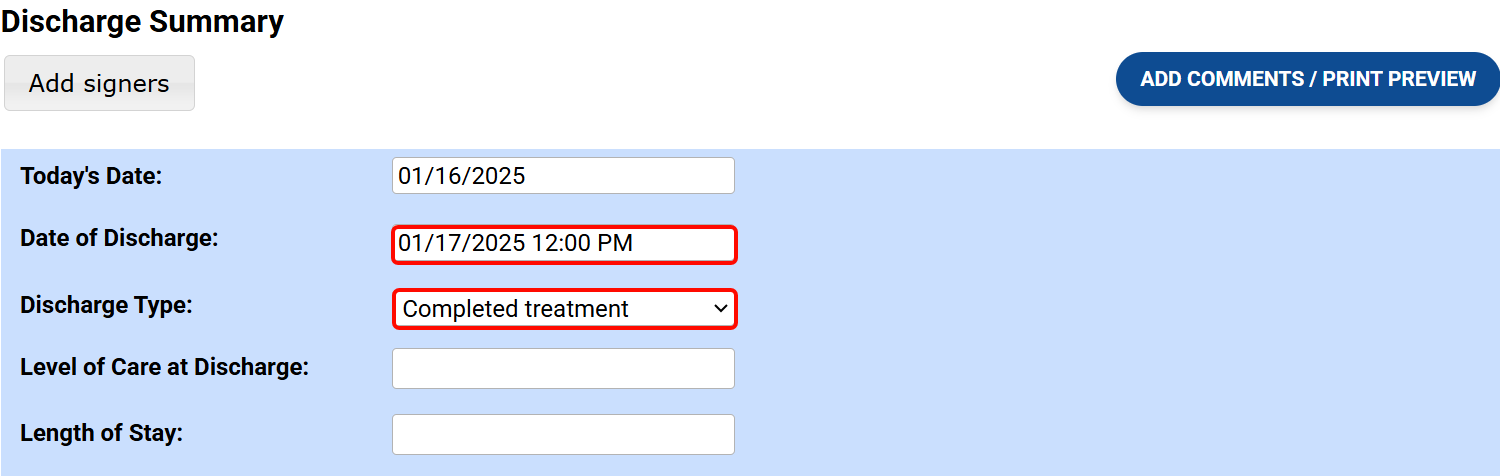 - Add the Discharge Summary evaluation using the centralized documentation icon and add the discharge type and date of discharge.