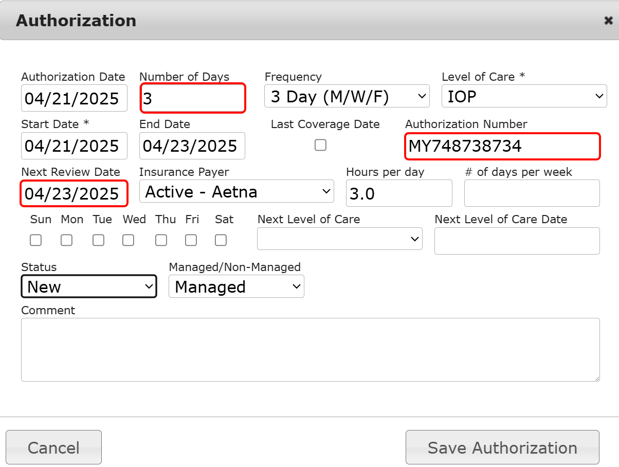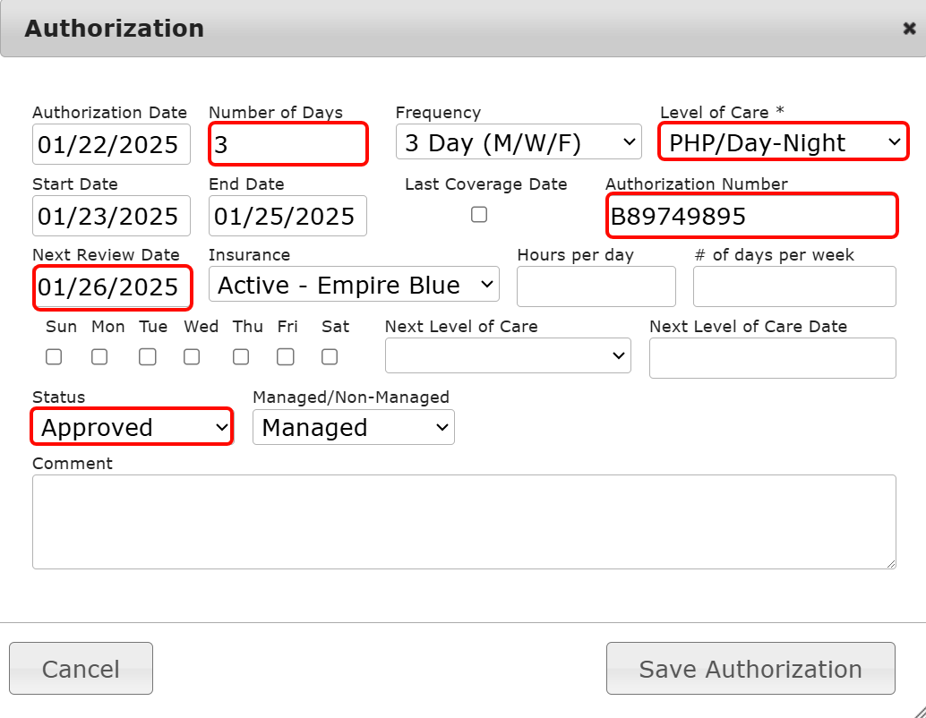 - Update the UR LOC in the authorization form including Number of Days, Authorization Number, Next Review Date.