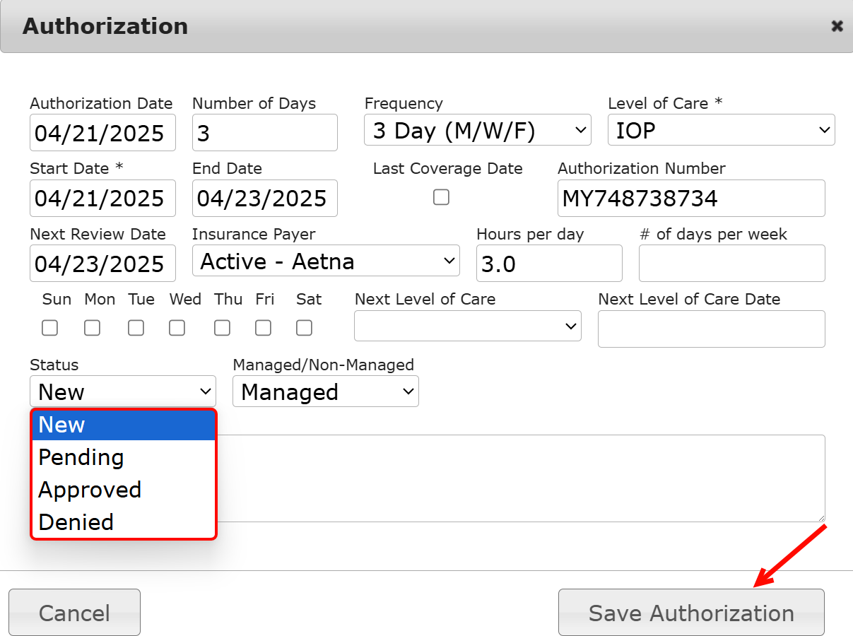 Best Practices: Use the New status immediately after creating a utilization review to indicate it is in draft and not yet submitted. Change the status to Pending once the review is formally submitted for approval, and update it to Approved or Denied only after receiving formal authorization or rejection, respectively. Create a new utilization review when the patient receives a new authorization number, a new Level of Care is authorized, an existing Level of Care is extended with a new authorization number, or the patient transitions between Levels of Care (e.g., Residential to Detox). Update an existing utilization review instead when the authorization is extended without a change in authorization number or when its status is updated (e.g., from New to Pending or from Pending to Approved/Denied).