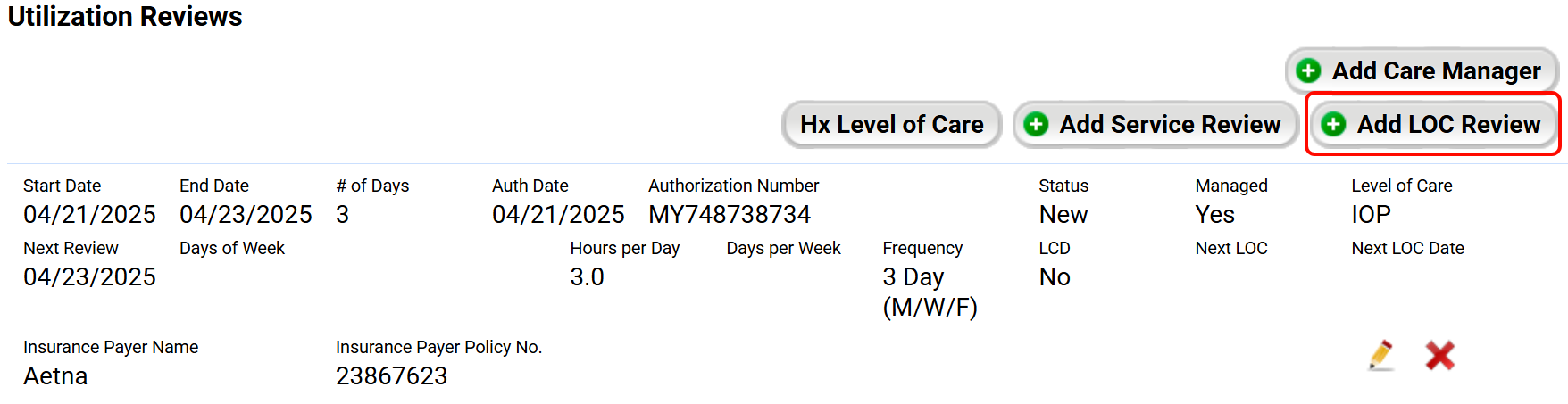 - Scroll to the Utilization Reviews section and click +Add LOC Review.