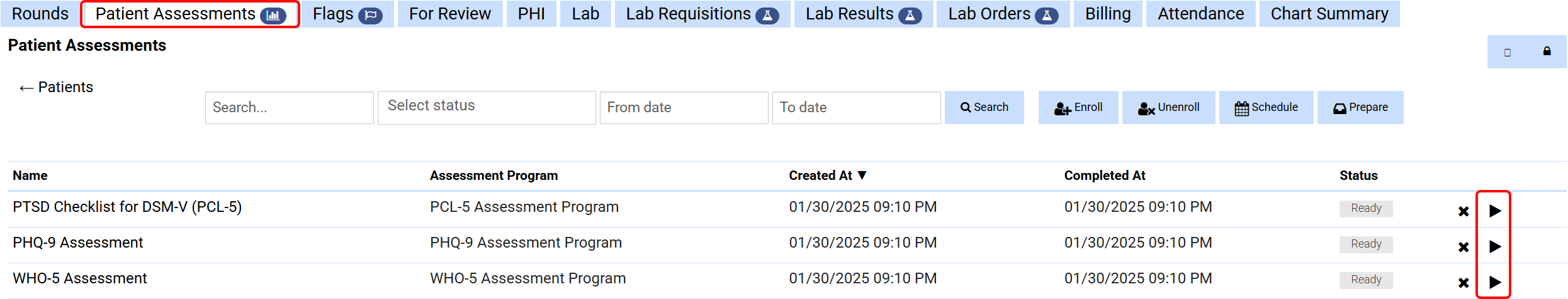 - Navigate to Patient Assessments/Outcome Measurements tab within the patient’s chart and click Play to start the required assessment.