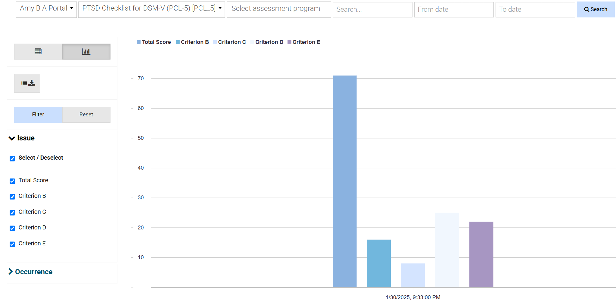 - The clinician navigates to the Patient Assessments/Outcome Measurements tab in the patient’s chart to review the completed assessment.