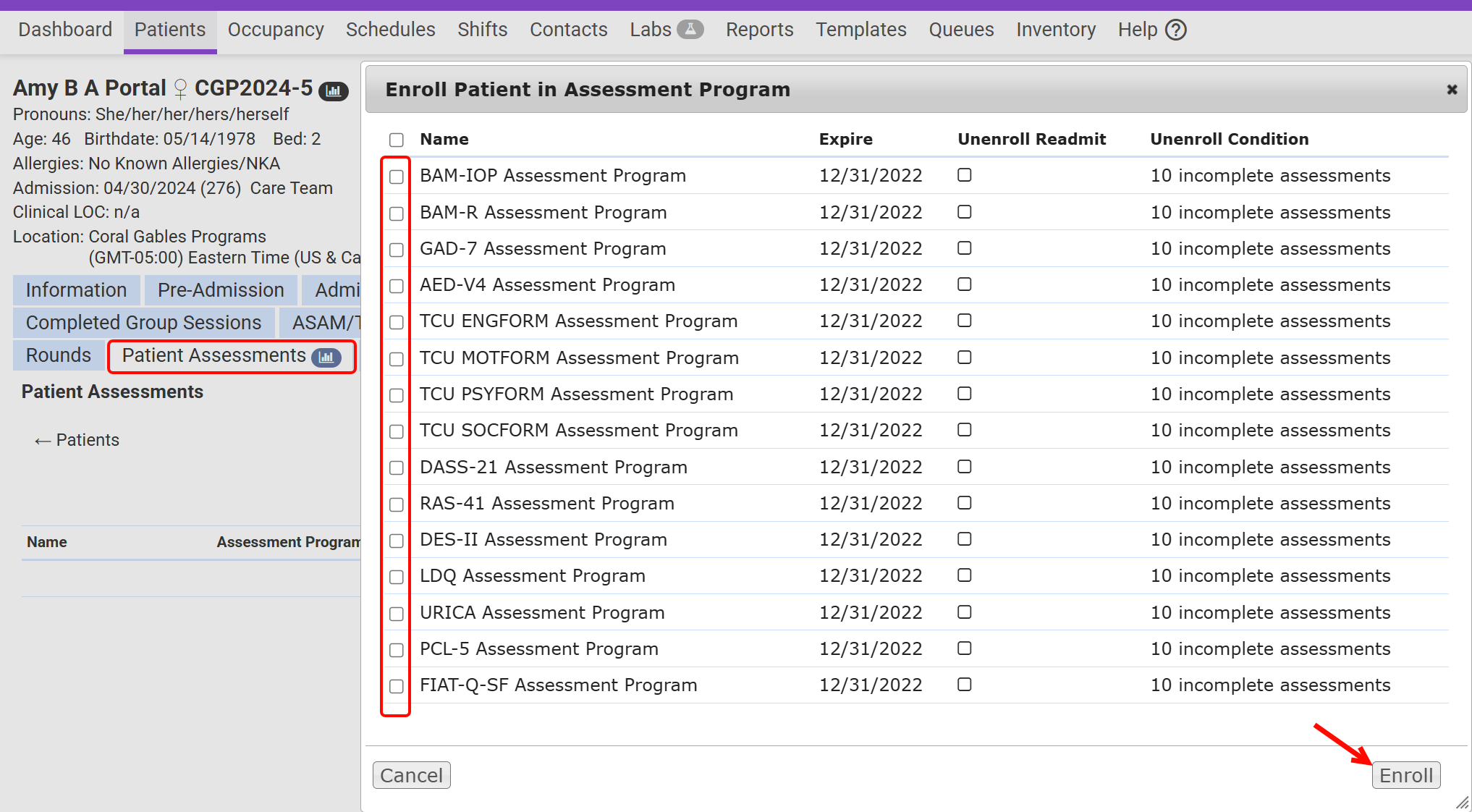 Best Practice: To ensure all patients complete required assessments, use the enroll at admission frequency for the specified assessment to eliminate the need for manual enrollment into the assessment program.