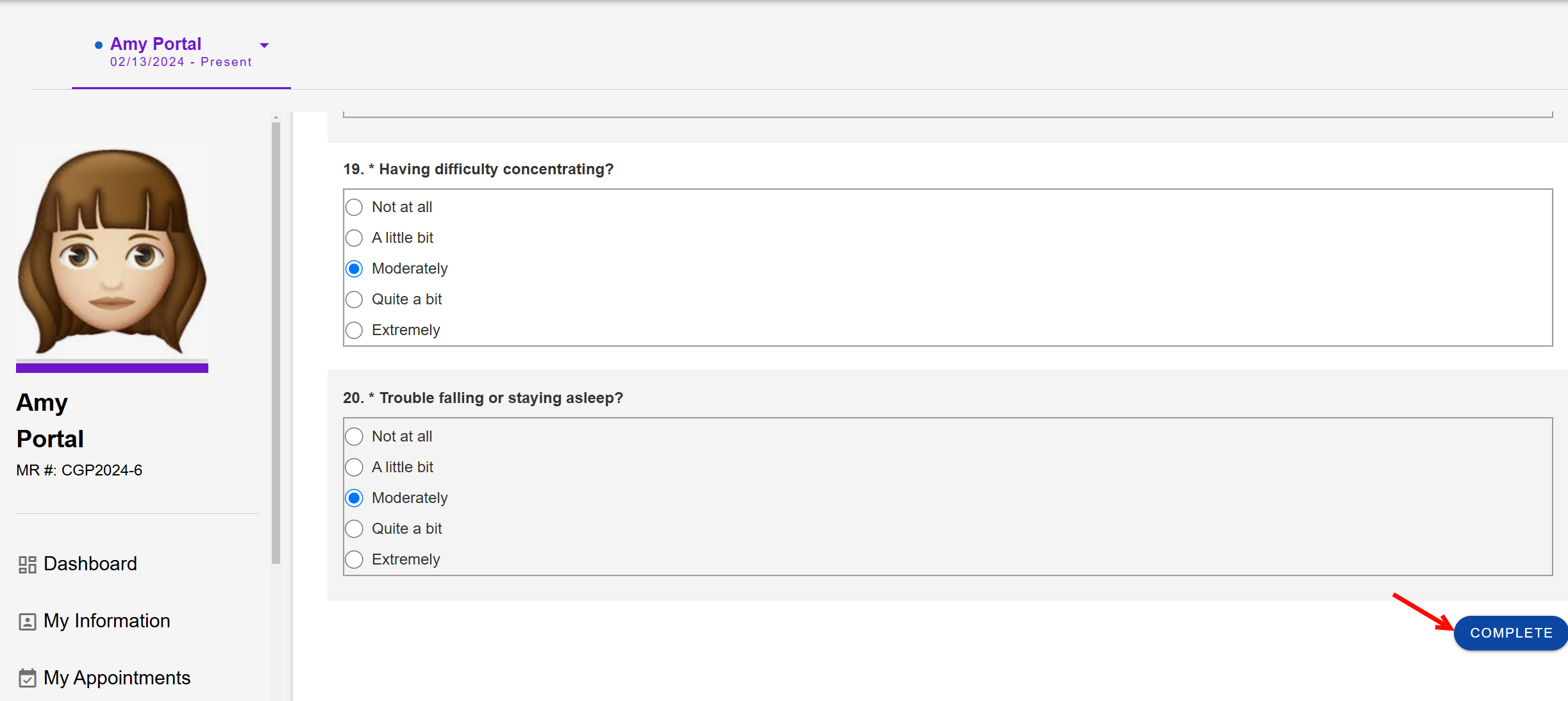 - After receiving a notification, the patient completes the assessment in the Patient Portal.