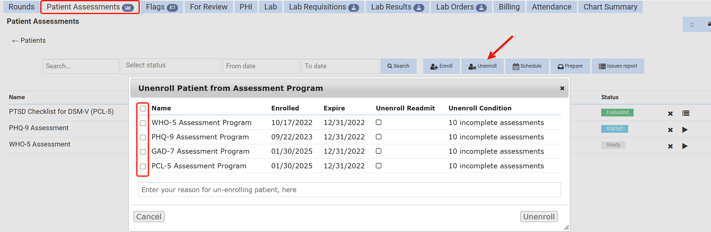Required Permissions: Super Admin, Records Admin, Assessment Manager, Assessment Operator, and Outcome Evaluator. Click here to learn more about the permissions necessary to enroll patients in assessment programs.