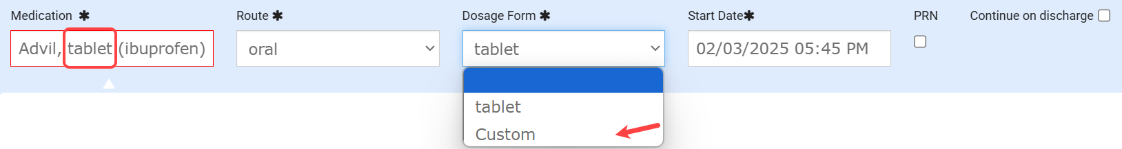 Doctor’s Orders: The medication search now includes dosage form. When a medication is selected, the route and dosage form will automatically populate in the order while still allowing for manual adjustments if needed. For more information on quick orders click here, for information on custom orders click here, and for information on eRx orders in the EMR click here.