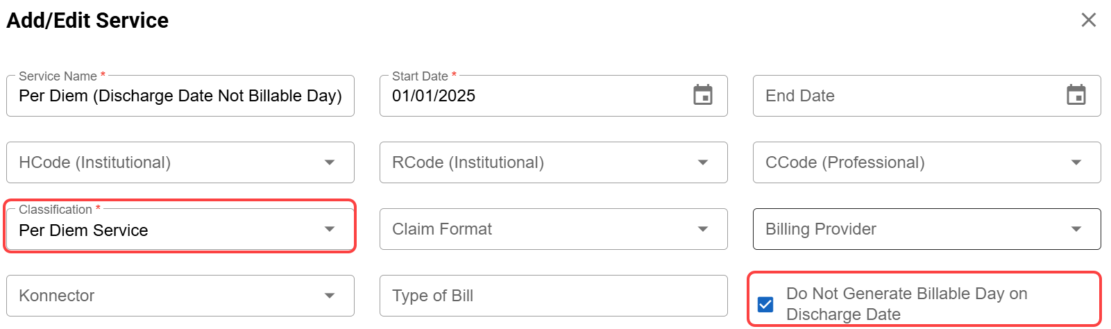 Billing: Added the ability to omit a per diem service billable item on the discharge date. Check out this article for more information on Billing Services.