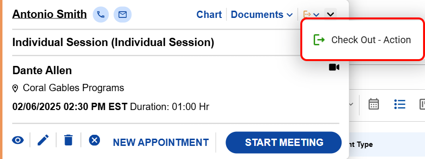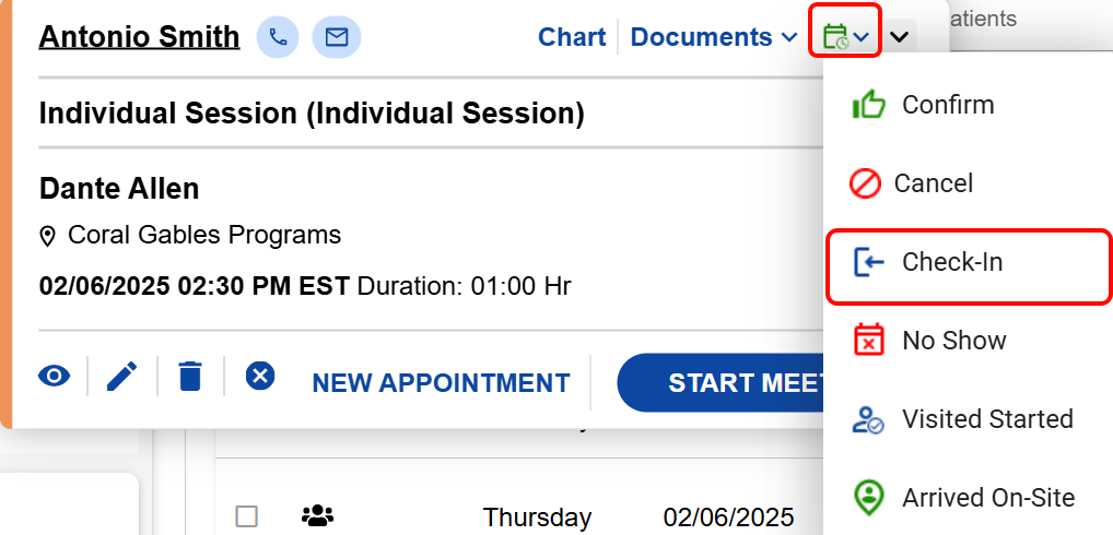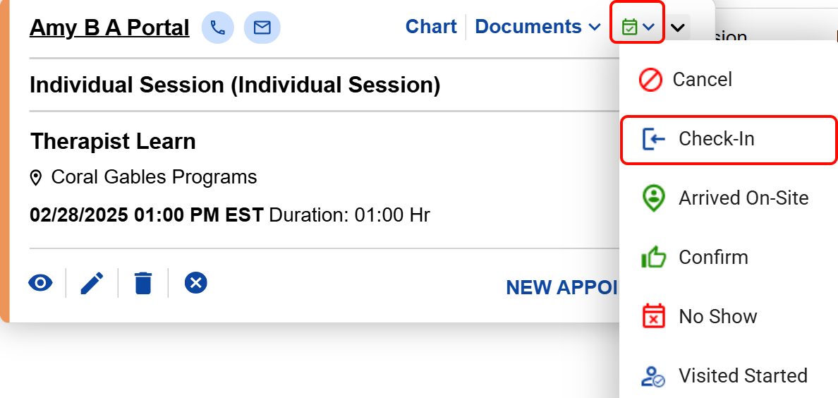 - Click the appointment status icon and select Check-In to indicate that the patient is present in Zoom on the Scheduler appointment card.