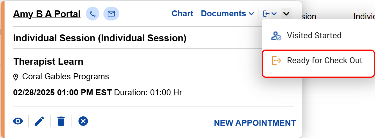 Important: If a different user schedules the follow-up appointment, the Ready for Check-Out step is unnecessary. Mark the appointment status as Checked Out.