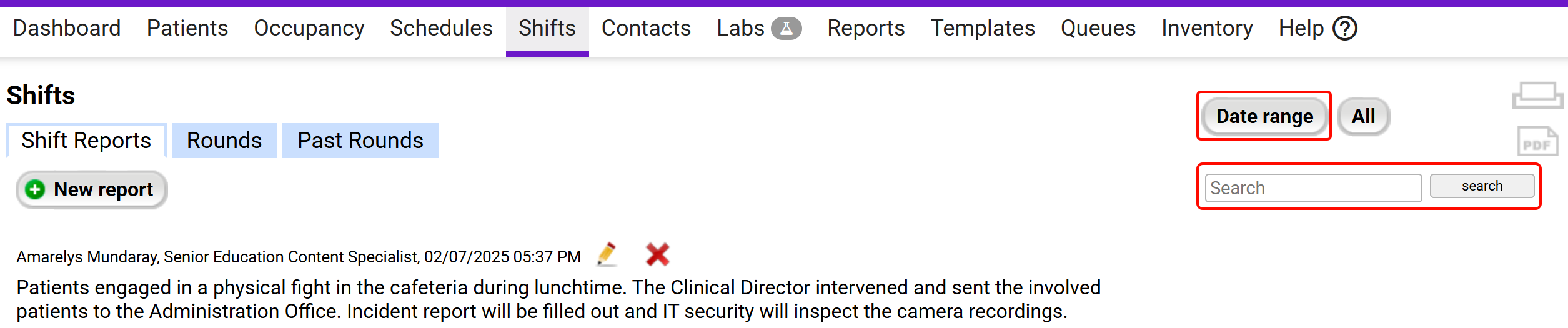 - The system will display the shifts report in chronological order. You can filter by date range or use the Search field to find specific keywords in past notes.