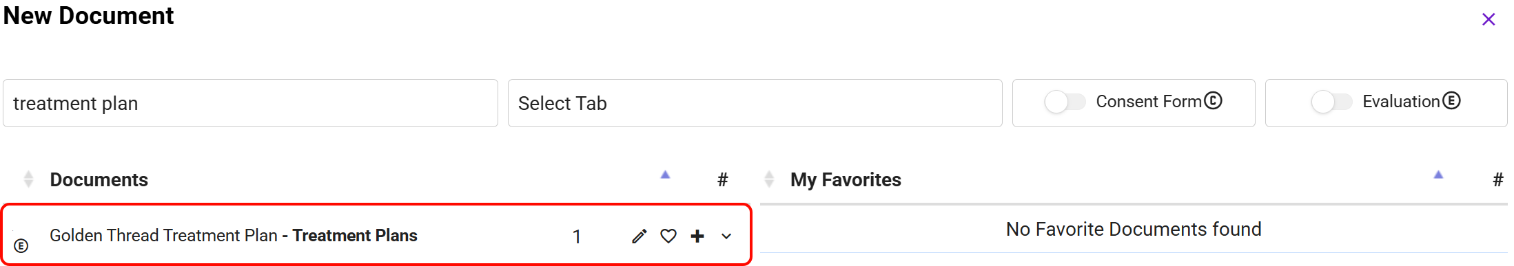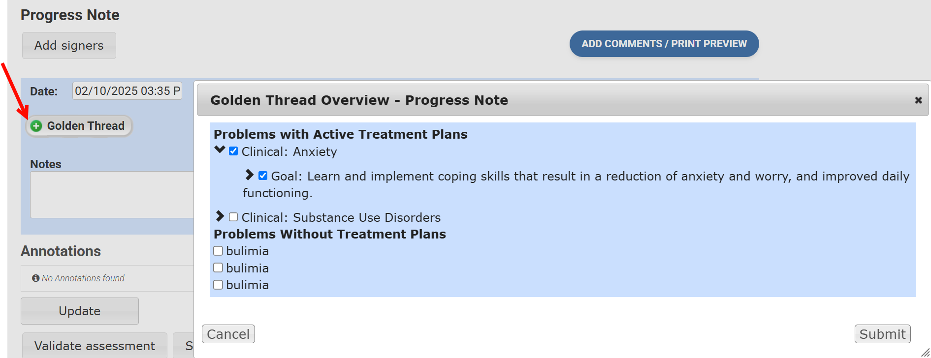 Utilize the Golden Thread button to link supporting documents (e.g., individual progress notes, group sessions, etc.) to the treatment plan.