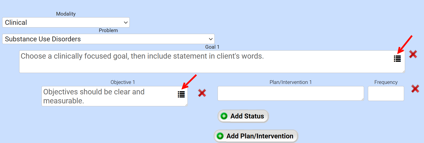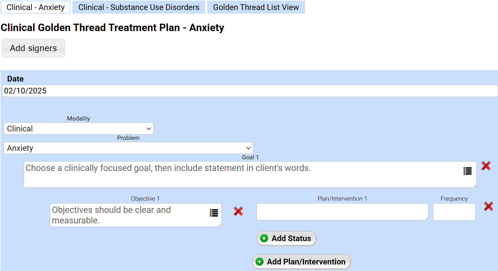 Best Practice: The Golden Thread feature includes pre-loaded Wiley Treatment Plan components, such as common addiction-related problems, diagnoses, behavioral definitions, goals, objectives, and interventions. However, most states and regulatory bodies require treatment plans to be customized for each patient. Use this content as a guide and incorporate patient statements to ensure individualized treatment.
