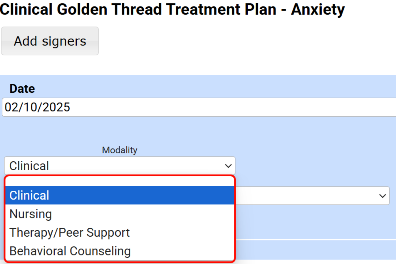 Important: The system defaults treatment plan modalities to Clinical and Nursing. Super admins can customize Golden Thread modalities such as Case Management, Medical, Alternative, Dietary, and others. However, modalities should not represent a level of care, as treatment plans remain active throughout treatment.