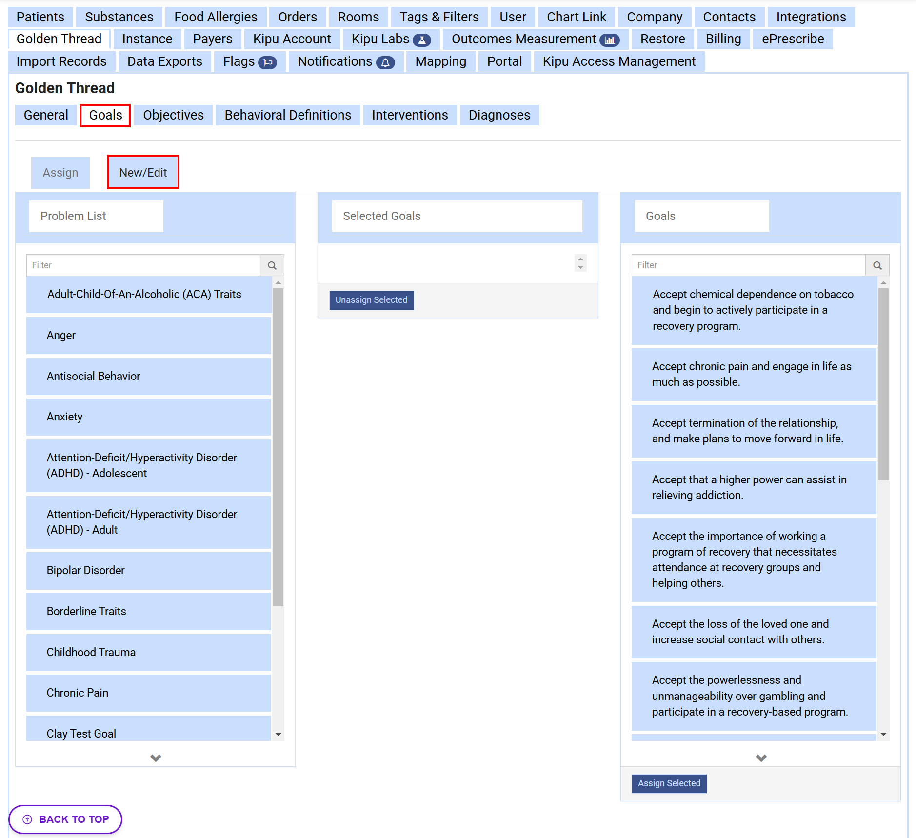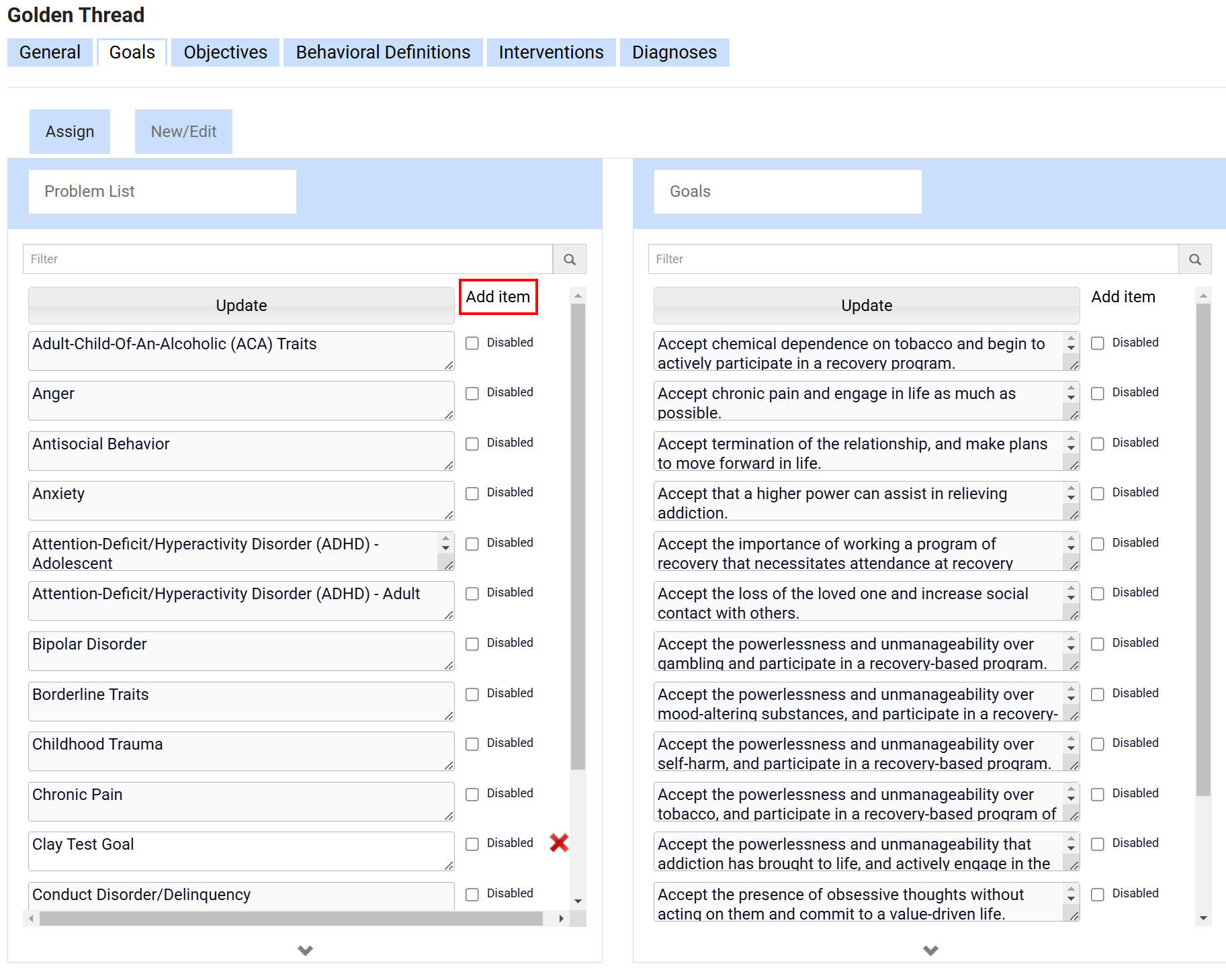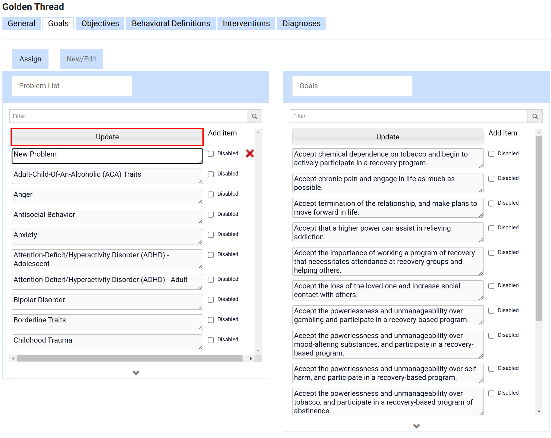 A user with the Super Admin role is able to update this within the Settings of the EMR. Follow the below steps to add new problems to your Golden Thread. There are two steps to adding a problem within the Golden thread. Creating the item itself and then attaching the Goals to it.