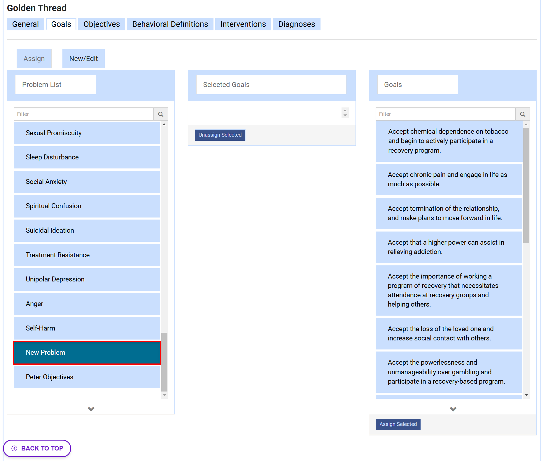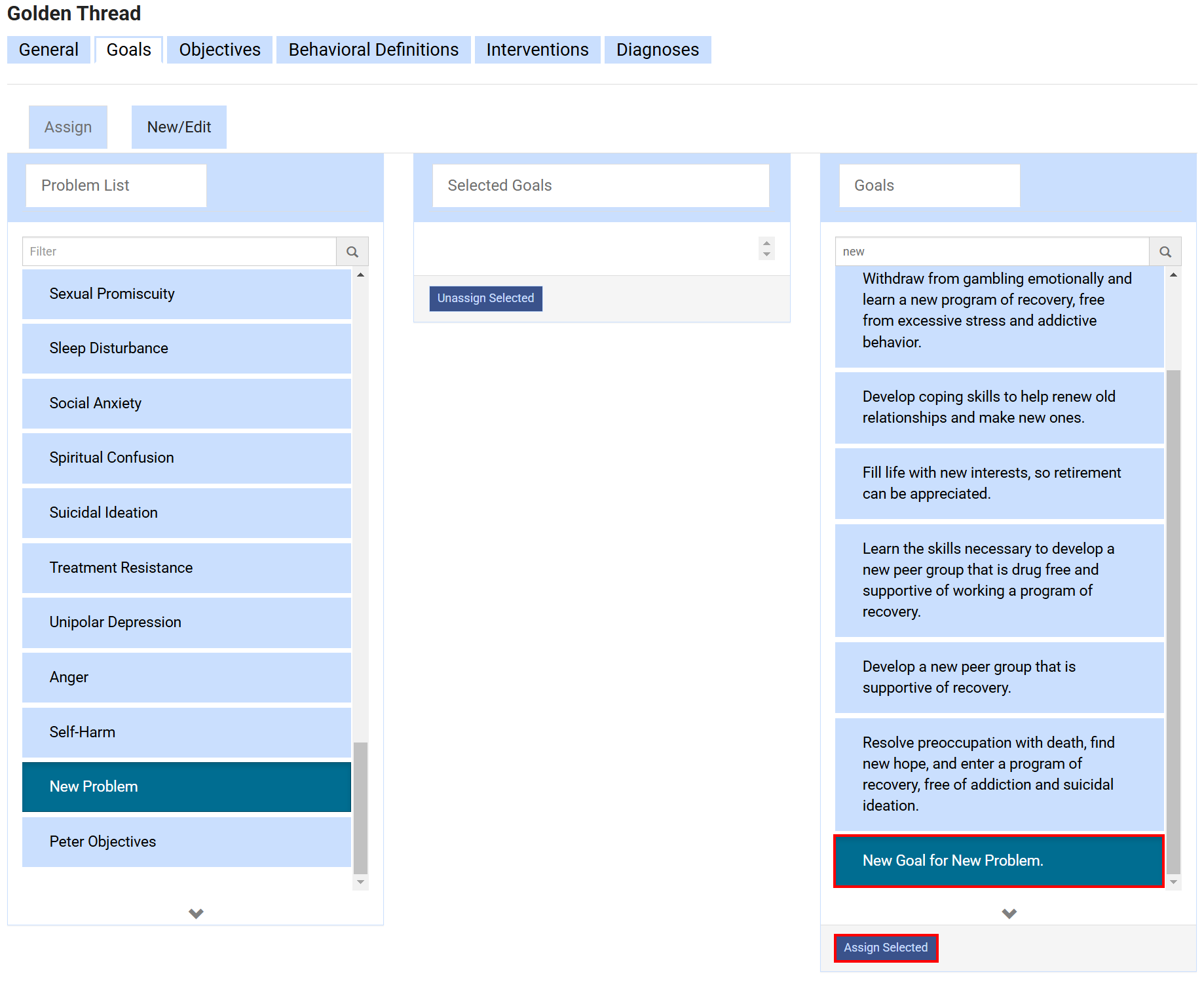The list is alphabetical, using the Filter is recommended. - The goal will now show up under the center column for your new problem.