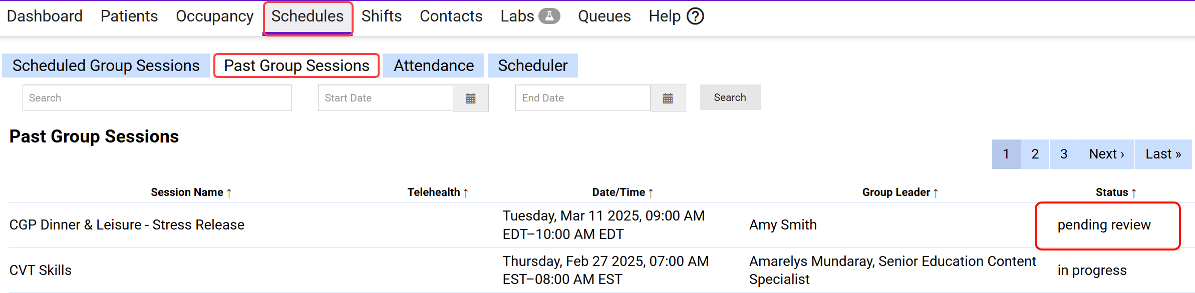 - Navigate to Schedules and select Past Group Sessions to find the sessions pending review.