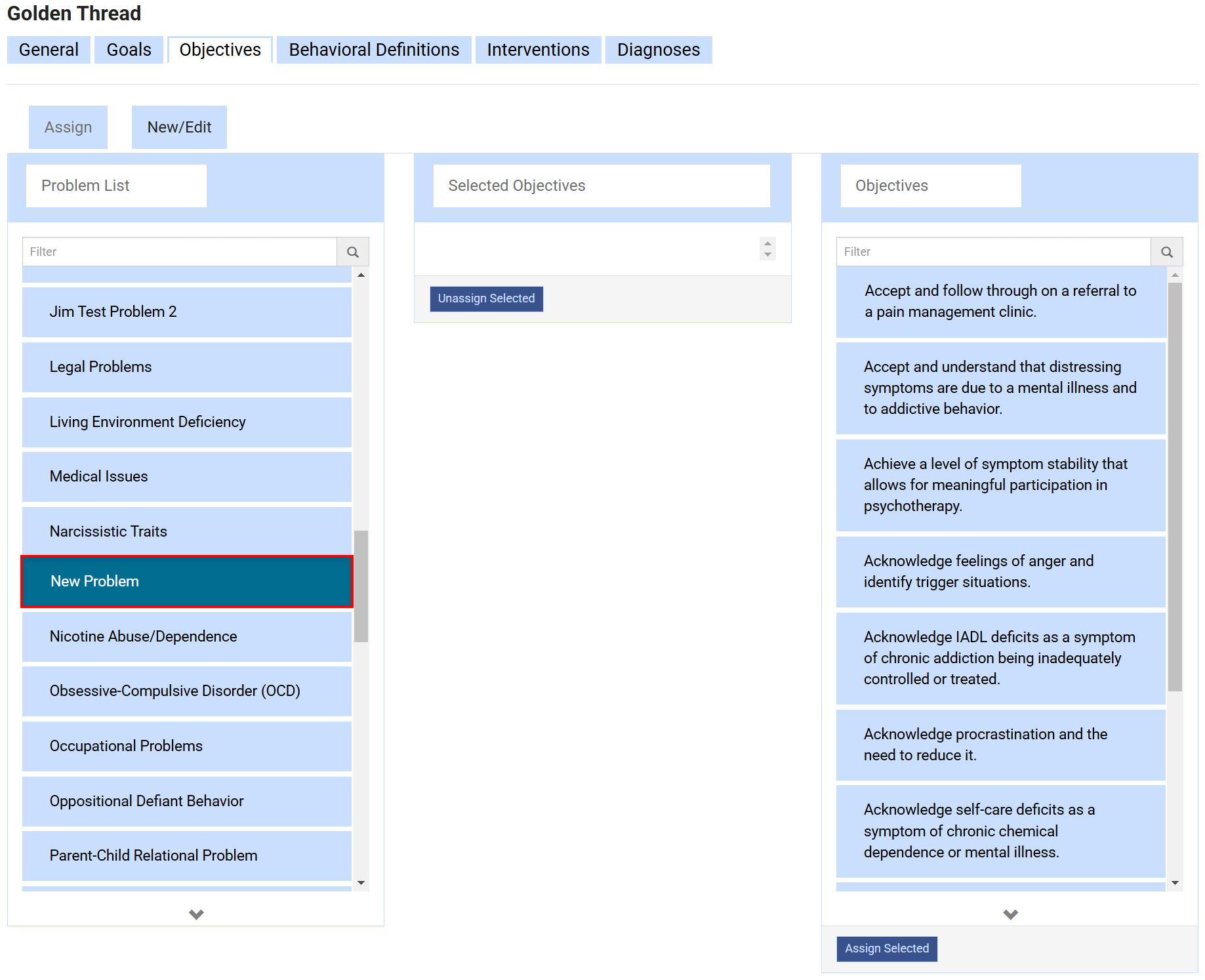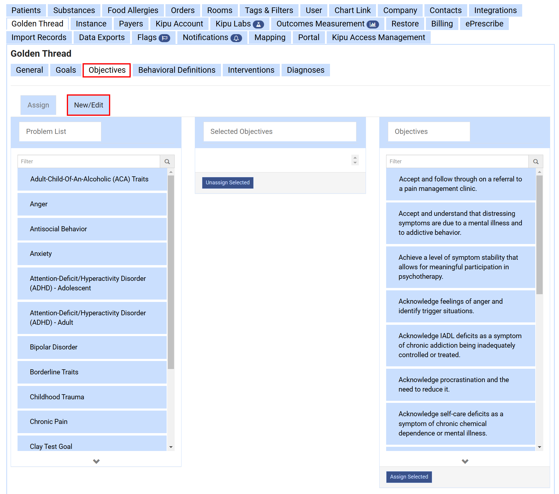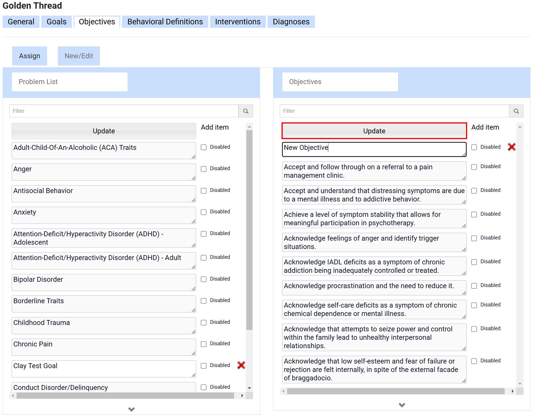 A user with the Super Admin role is able to update this within the Settings of the EMR. Follow the below steps to add new Objectives to your Golden Thread. There are two steps to adding an Objective within the Golden thread. Creating the item itself and then attaching it to the Problem.