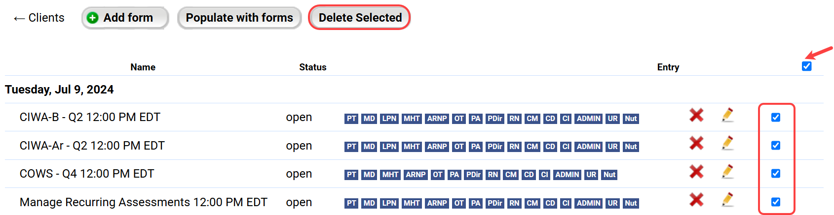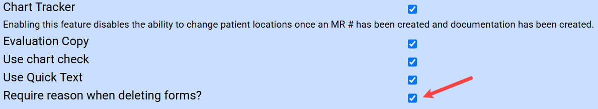 Forms: Super Admins and Record Admins can now bulk delete forms in the Open status. A checkbox has been added next to all open consent forms and evaluations, together with a Delete Selected button that will delete all selected forms. For more information on the forms found in patient charts, check out this article.