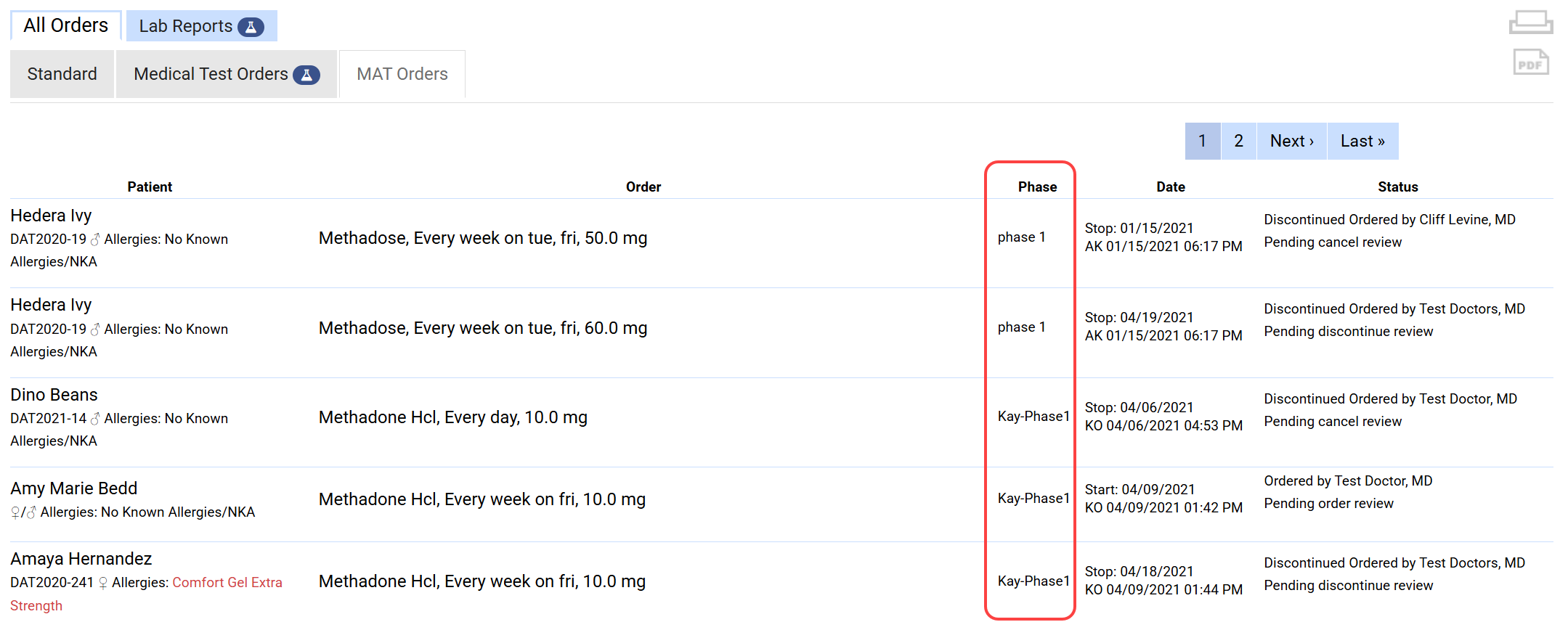 Physician Review Dashboard: A new Phase column has been added to the MAT Orders tab for the items pending signature, providing more complete information when signing orders.