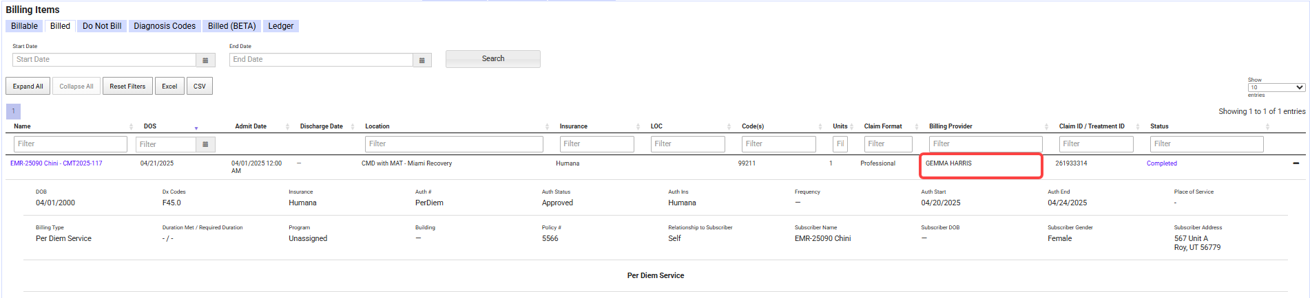 - Billing: Fixed an issue that caused Per Diem Service billable items to continue using the old insurance payer on unbilled items after insurance was updated to a different payer.
