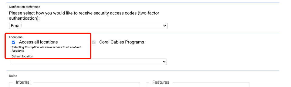New View Each user will have an Access All locations checkbox. Any user who needs to be able to find a user without a location assigned, should have this box checked. |