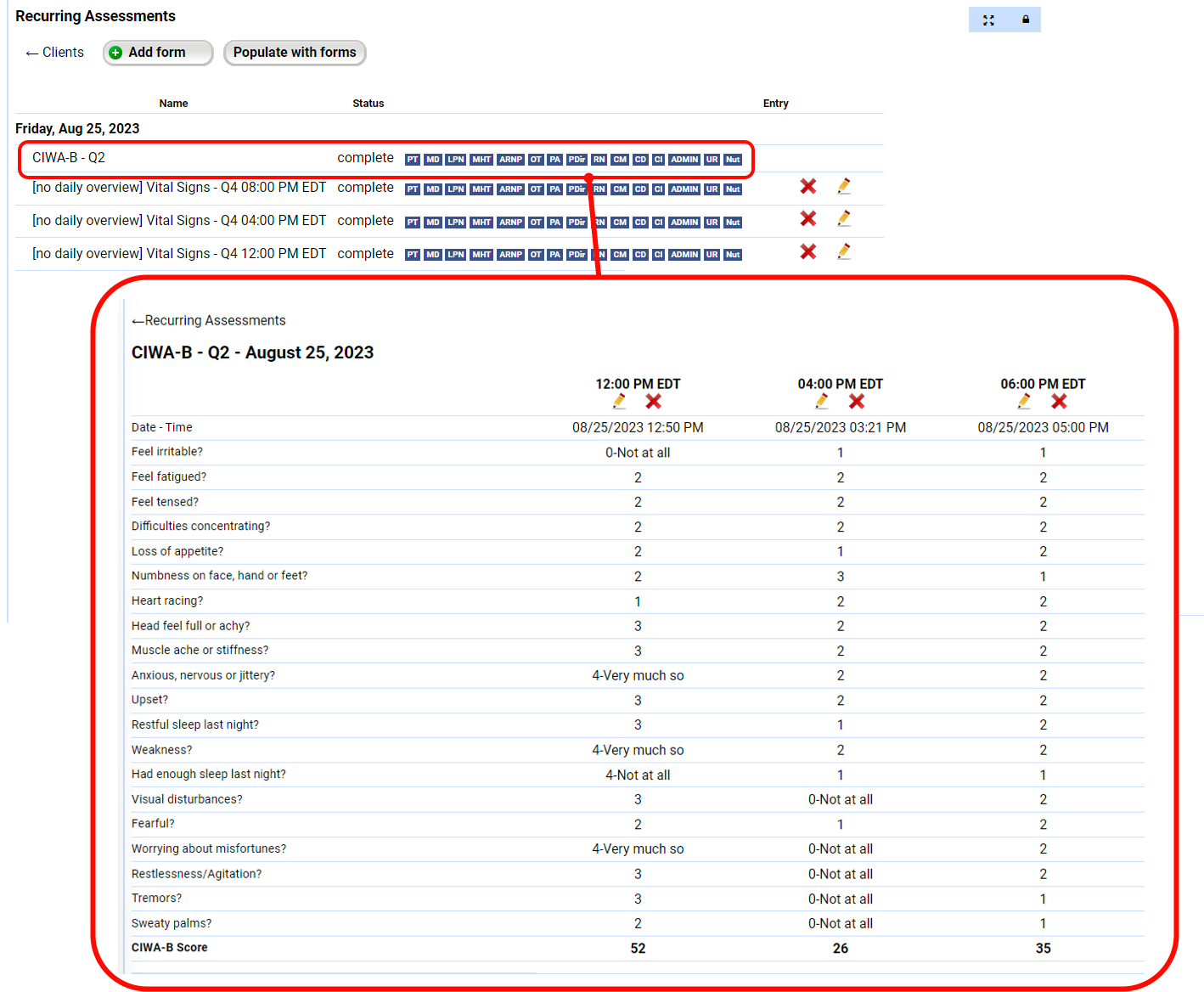 - Once the "first" evaluation is added, the additional forms will populate automatically based on the template's frequency (e.g., every 360 minutes a new form will be automatically added to the patient chart tab for completion).