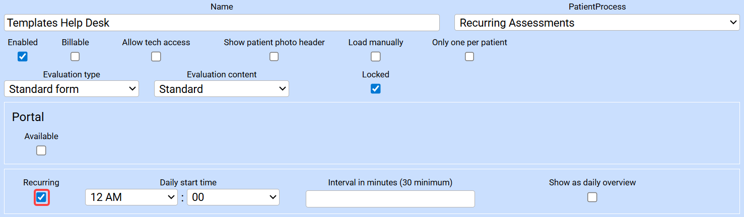 The Recurring Assessments feature can be used for the forms that you need to populate within the patient's chart repeatedly at specific intervals. Any evaluation form can be set as a recurring assessment and automatically populate within the chart.