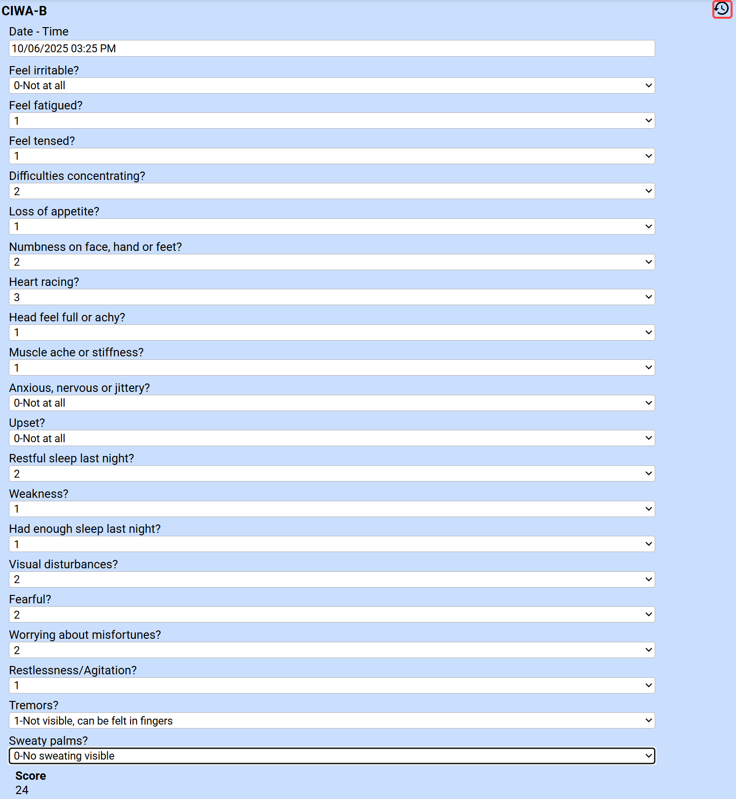 You can click the clock icon to view the patient's past history, including trend analysis. Alternatively, if the patient.ciwa_ar_current field is added to the evaluation, the patient's most recent CIWA-AR results will automatically display.