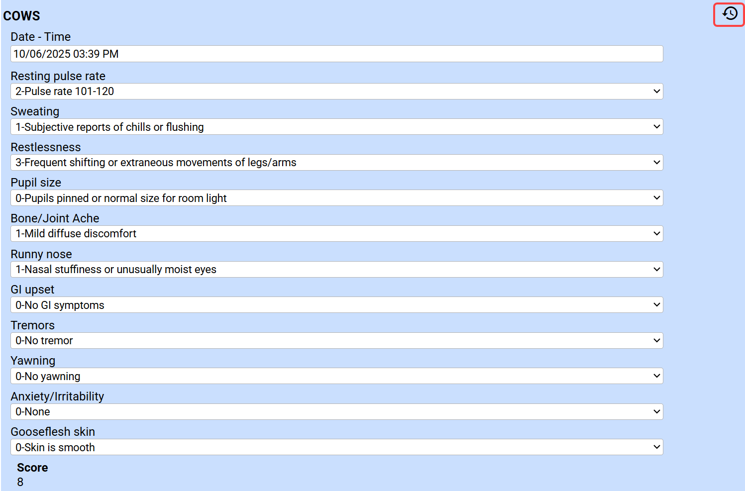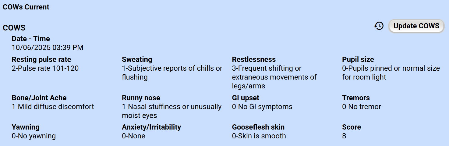 COWs: Select the date/time administered and use the drop-downs to complete each of the fields. The score will automatically calculate. Click Submit.