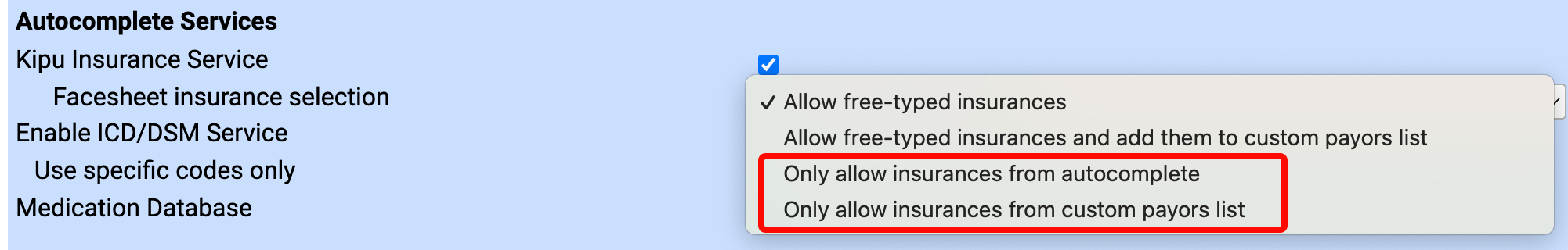- From the facesheet insurance select drop-down, choose Only allow insurance from autocomplete or Only allow payers from Custom Payers list.