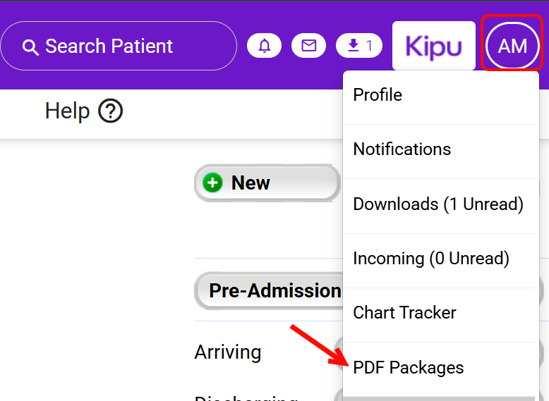 - Click on your initials and choose PDF Packages.