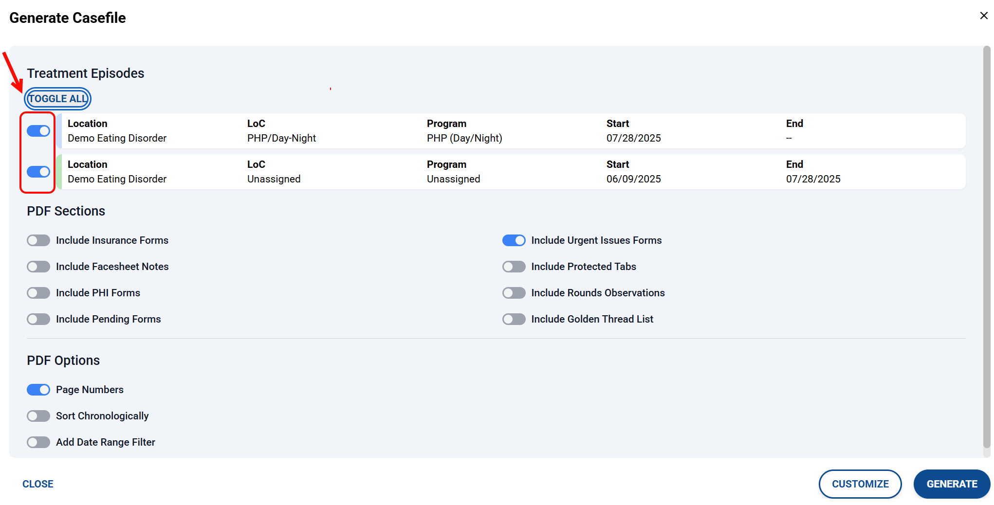 - Select the Toggle All option to include every treatment episode.