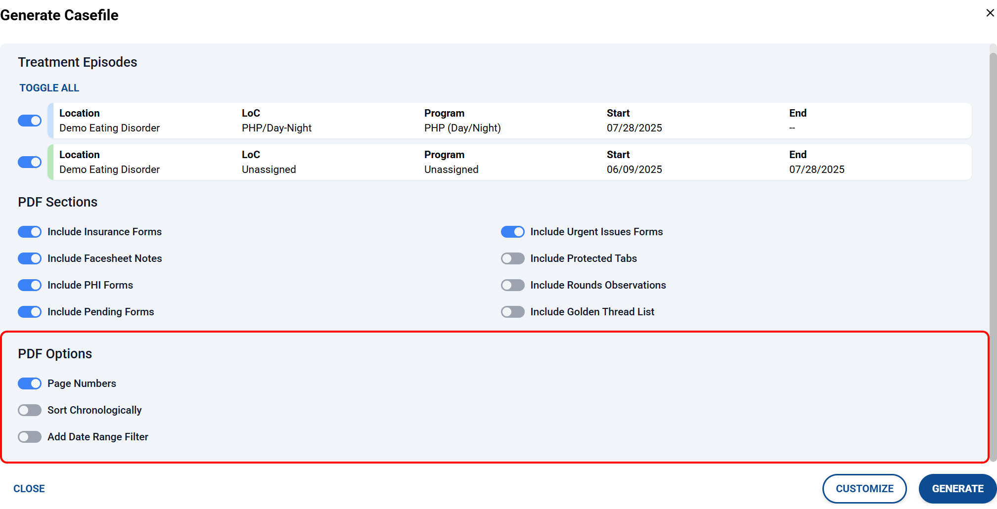 - You can customize the items in PDF Sections and PDF Options by setting the toggles to on for the documents you want to include from the selected treatment episodes.
