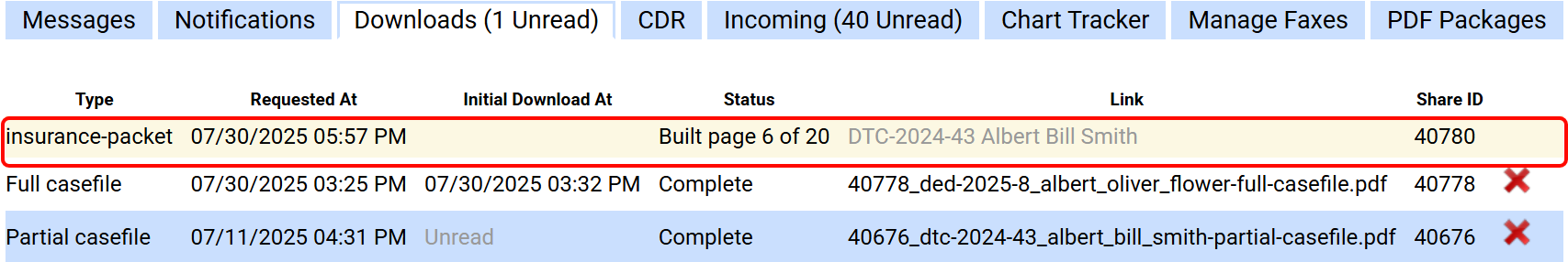 Depending on the size of the case, generation can take several minutes to several hours. Once the PDF package is generated, you’ll receive a notification in the EMR header.