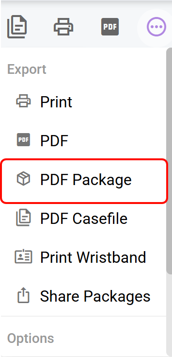 - Open the patient chart and click on the PDF Package icon.