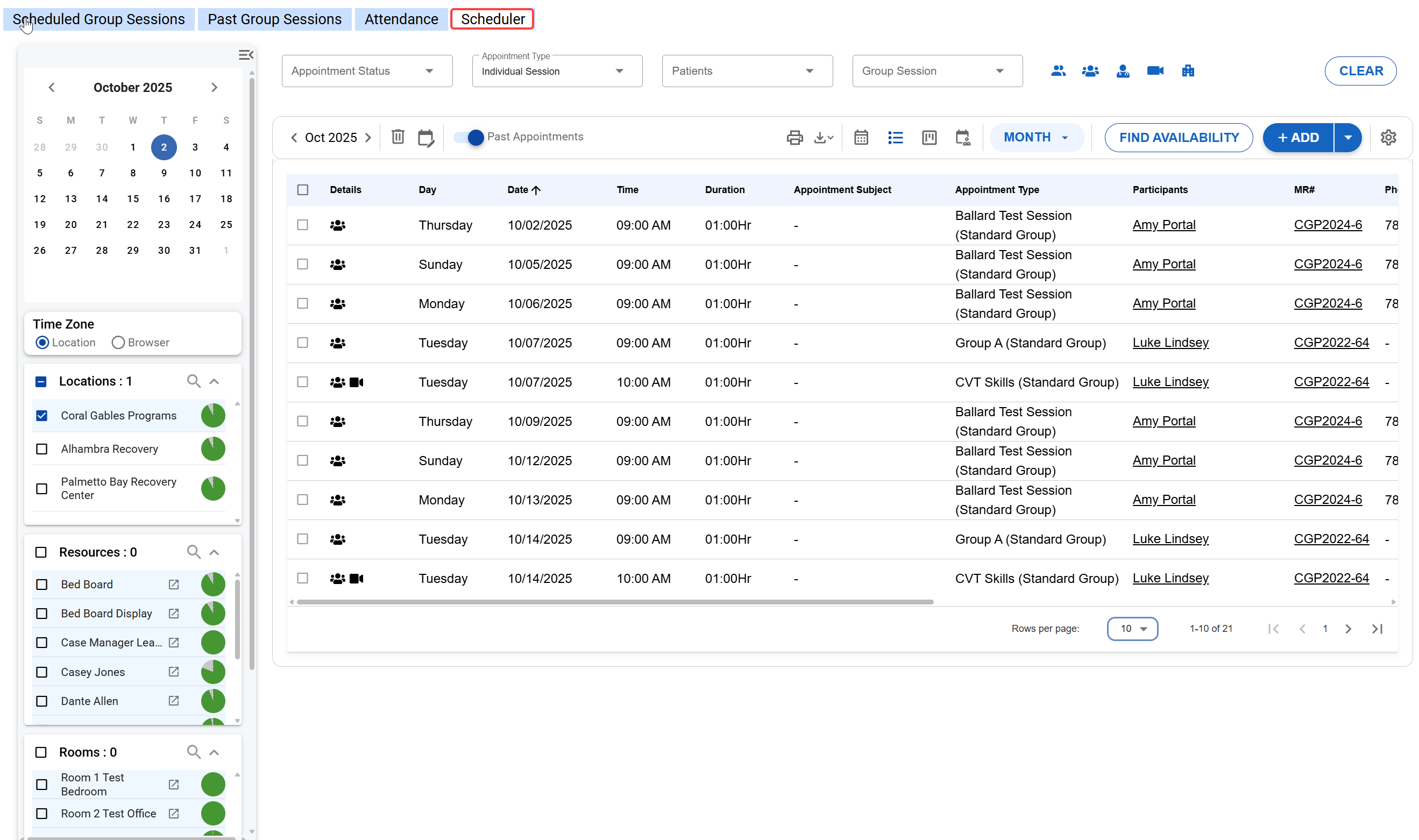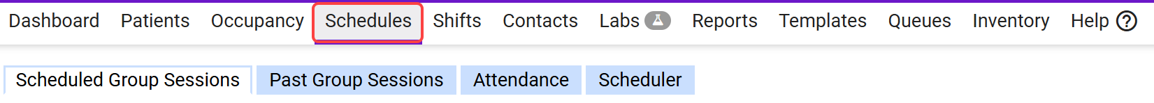 The Schedules tab allows you to start and document Group Sessions, view Scheduler (or the legacy Calendar), and track patient attendance.